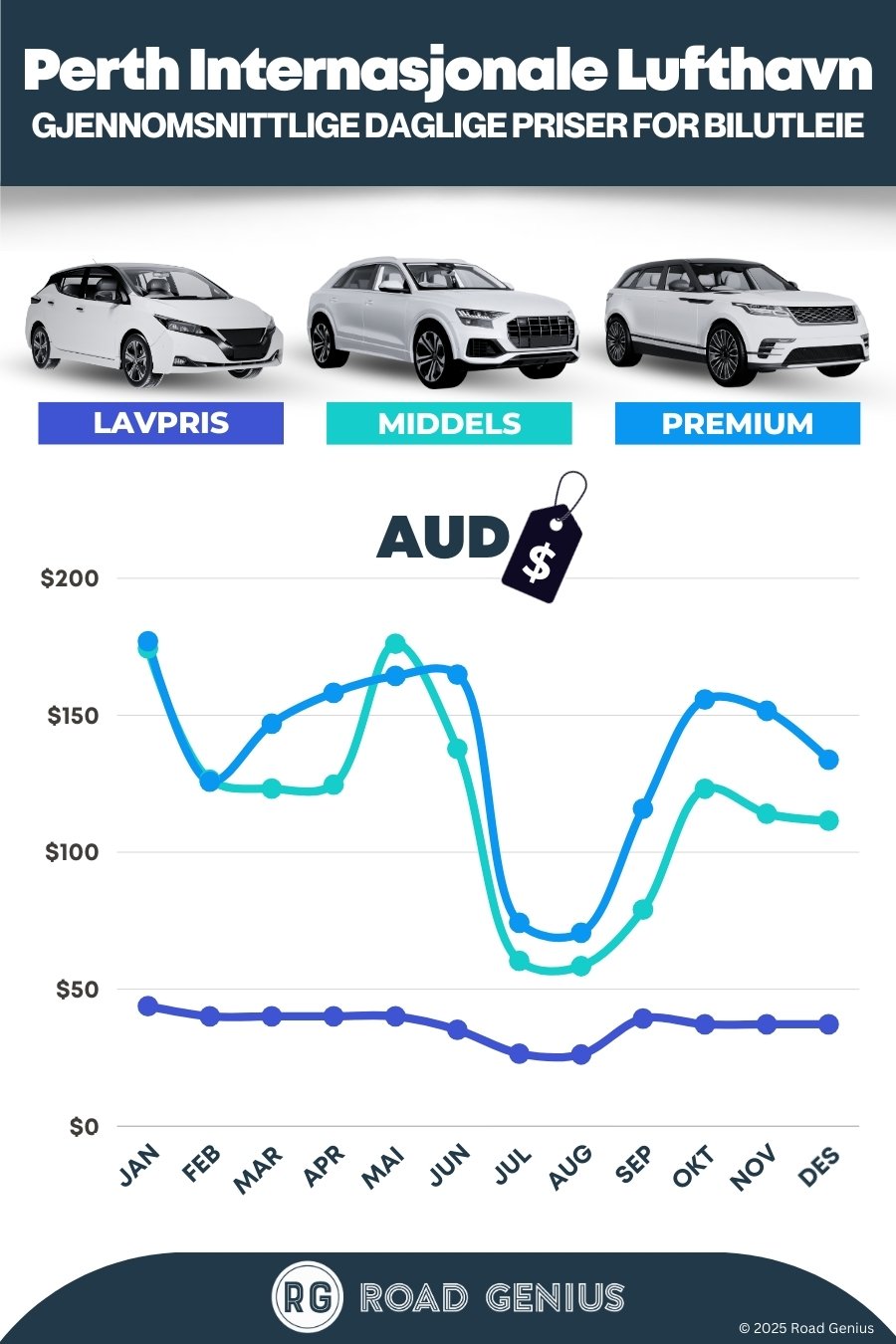 I gjennomsnitt koster leiebil på Perth lufthavn (PER) rundt AUD 124 per dag, og de laveste prisene starter på AUD 26 per dag.