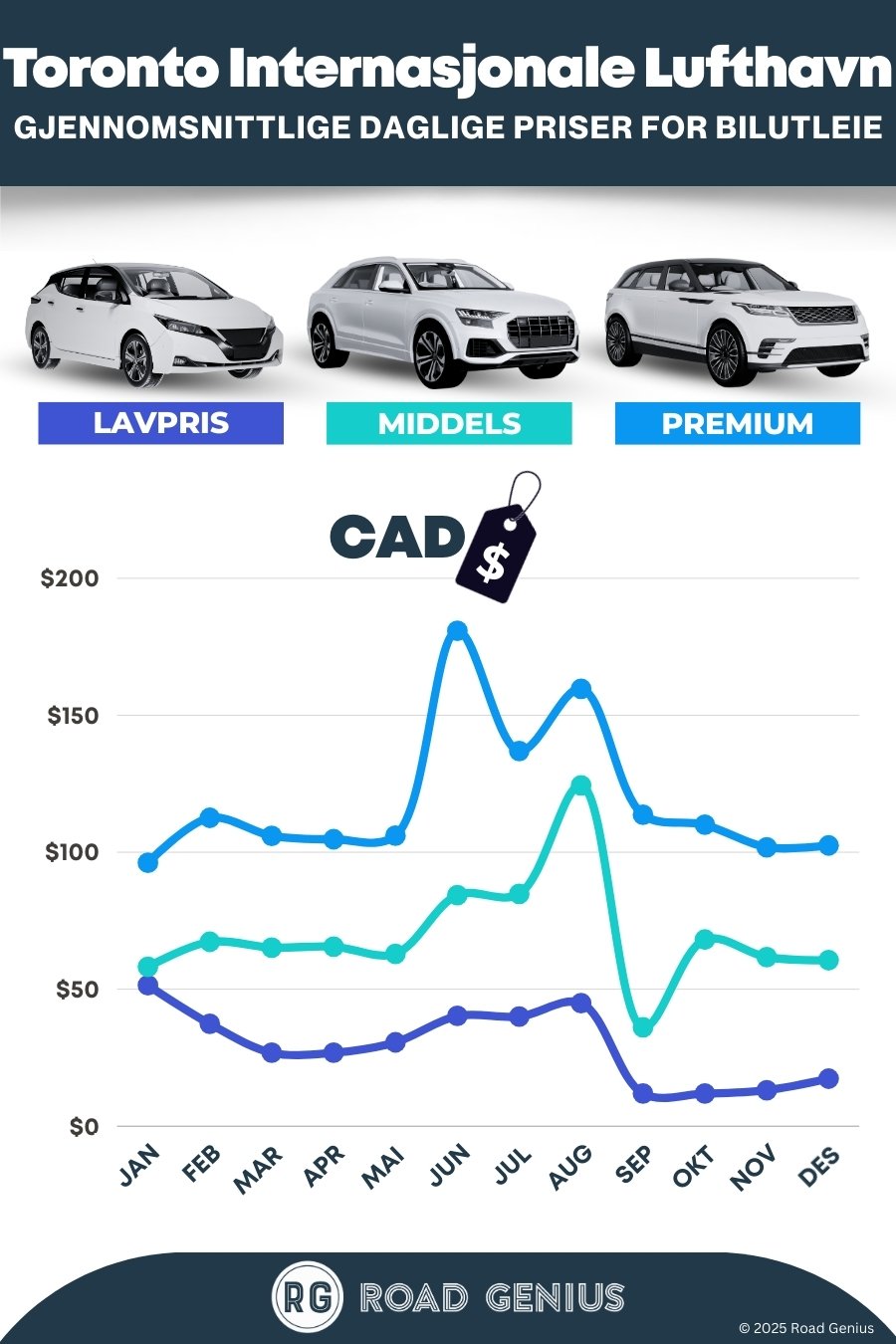 I gjennomsnitt koster bilutleie på Toronto internasjonale lufthavn rundt CAD 73 per dag, med de billigste alternativene fra CAD 12 per dag.