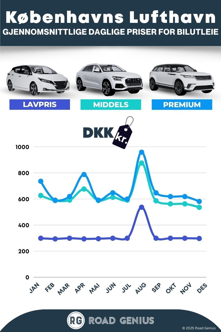 I gjennomsnitt koster bilutleie på København lufthavn rundt 533 kr per dag, med de billigste alternativene fra 294 kr per dag.