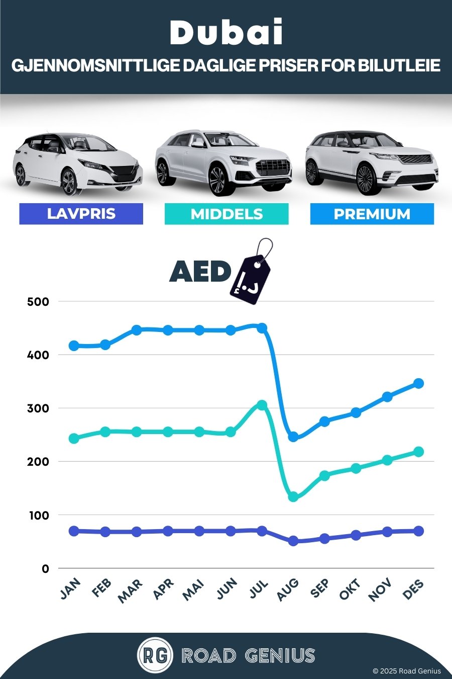 I gjennomsnitt koster bilutleie i Dubai rundt AED 224 per dag, med de billigste alternativene fra AED 51 per dag.