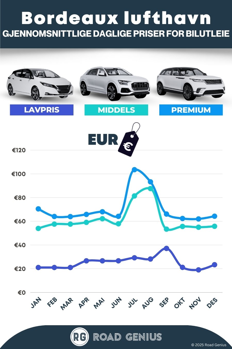 I gjennomsnitt koster bilutleie på Bordeaux lufthavn rundt €52 per dag, med de billigste alternativene fra €19 per dag.