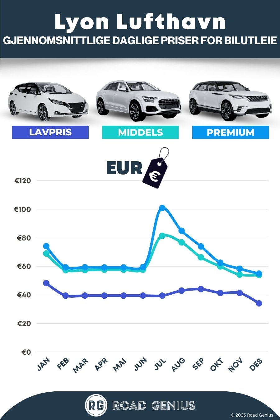 I gjennomsnitt koster bilutleie på Lyon lufthavn rundt €57 per dag, med de billigste alternativene fra €34 per dag.