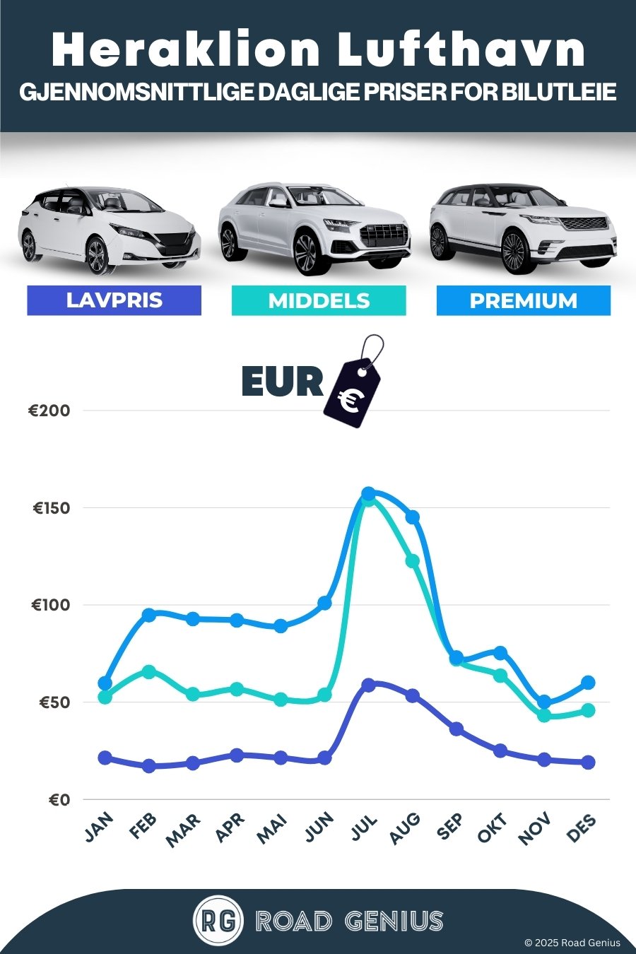 I gjennomsnitt koster bilutleie på Heraklion lufthavn rundt €63 per dag, med de billigste alternativene fra €17 per dag.