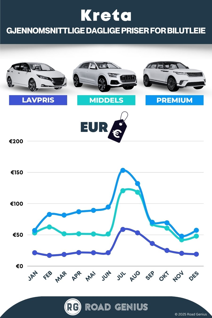 I gjennomsnitt koster bilutleie i Kreta rundt €59 per dag, med de billigste alternativene fra €17 per dag.