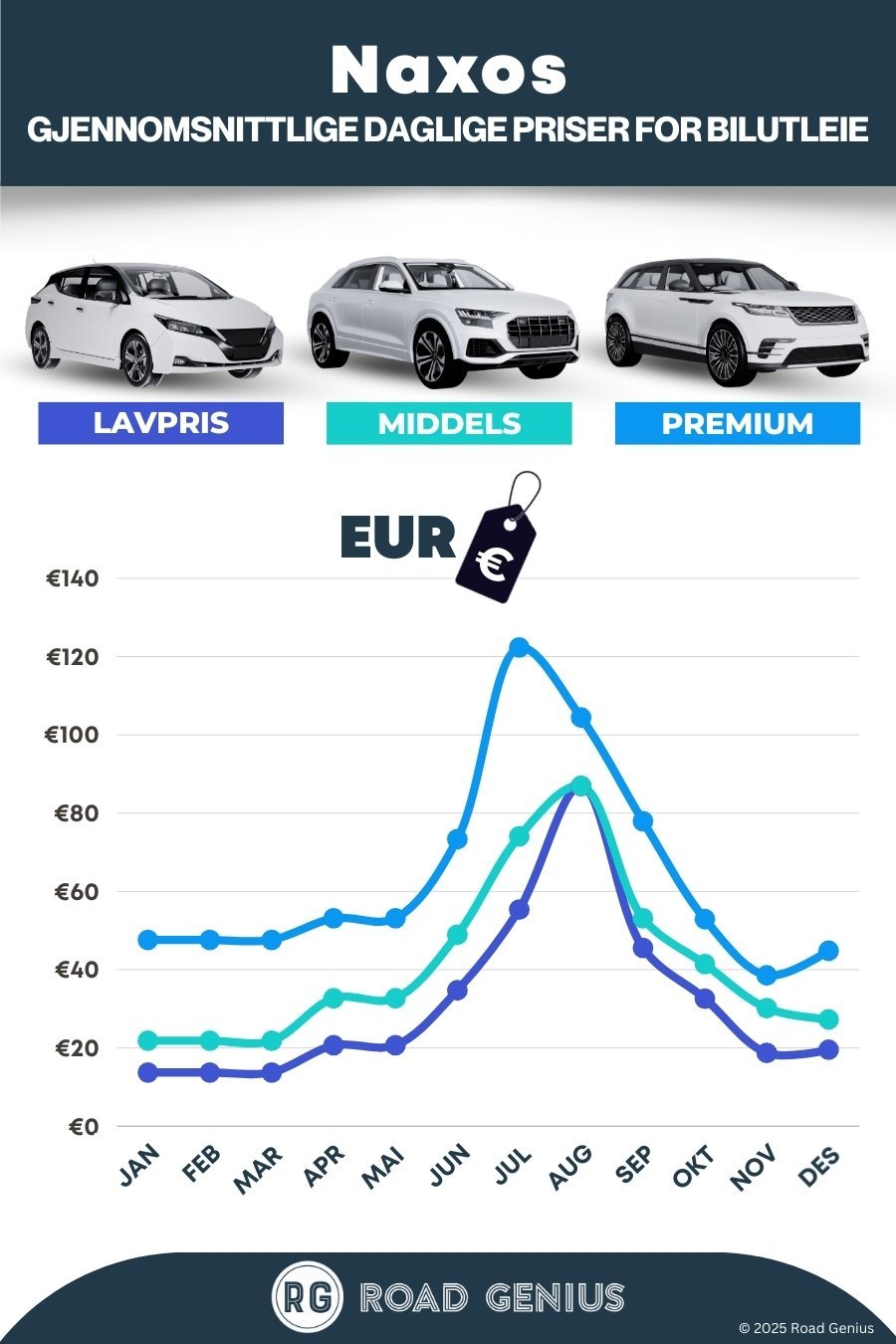 Bestill tidlig for juli–august: Bilene blir raskt utsolgt i høysesongen. For mai, juni og september kan du sammenligne nærmere avreisedato eller prøve å leie direkte på et utleiekontor i byen.