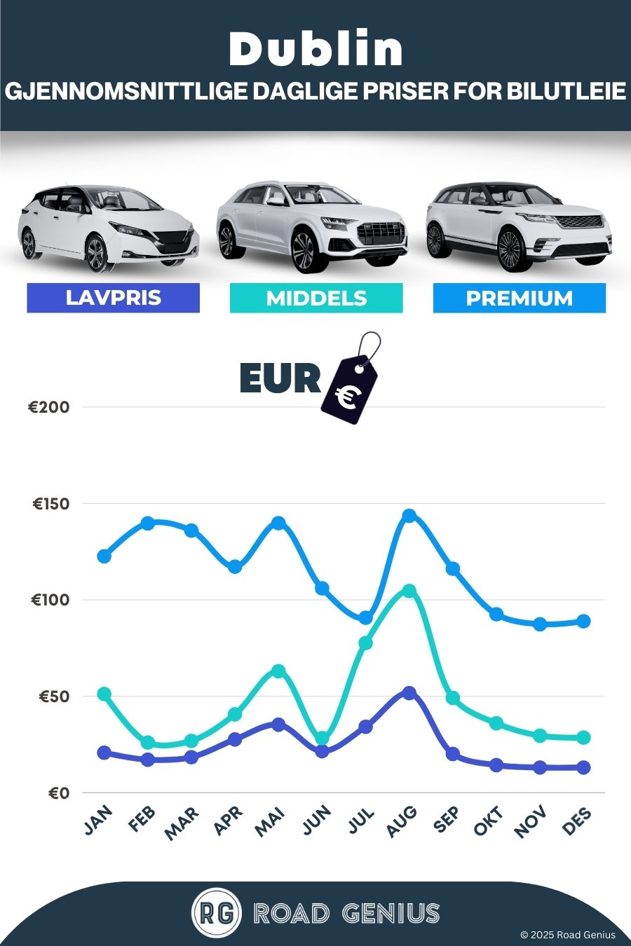 I gjennomsnitt koster bilutleie i Dublin rundt €62 per dag, med de billigste alternativene fra €13 per dag.