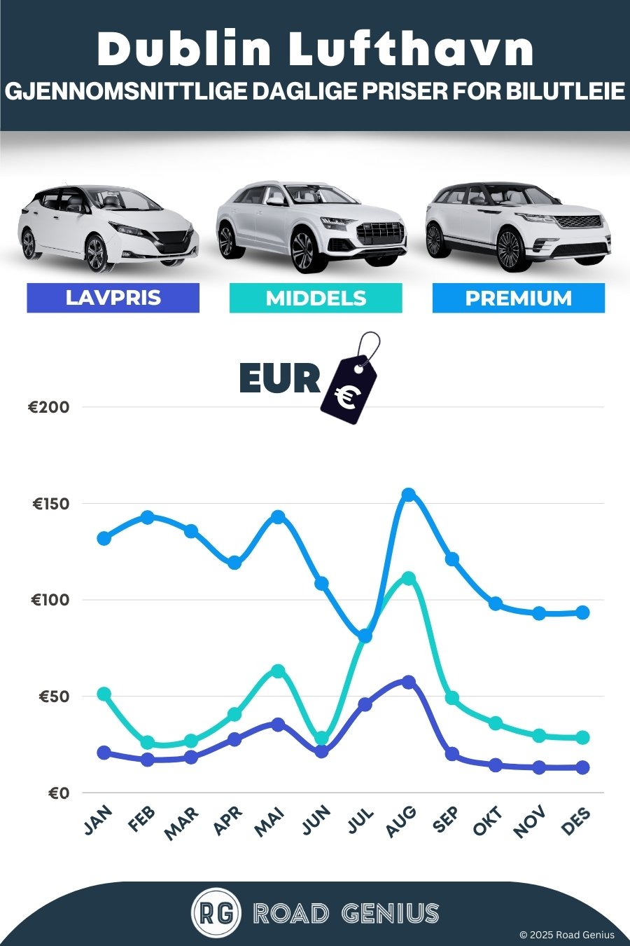 I gjennomsnitt koster bilutleie på Dublin lufthavn rundt €64 per dag, med de billigste alternativene fra €13 per dag.