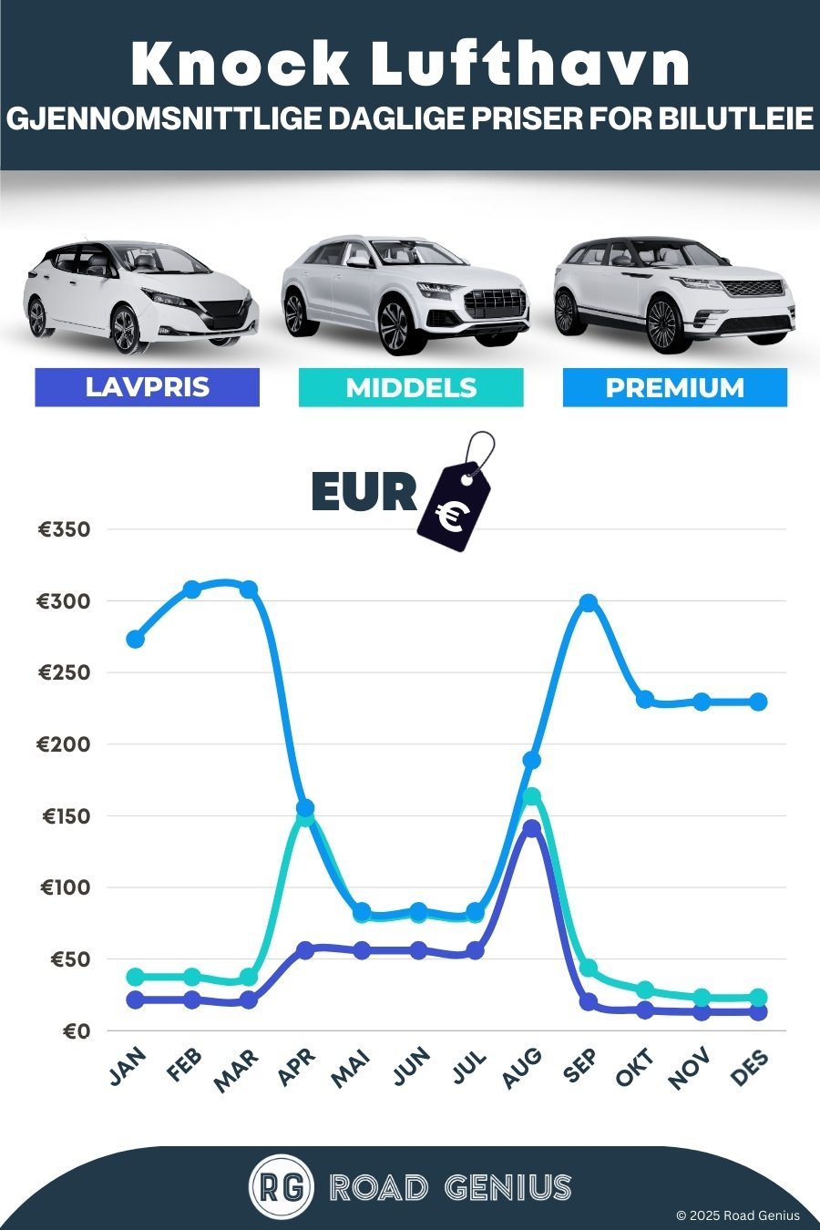 I gjennomsnitt koster bilutleie på Knock lufthavn rundt €104 per dag, med de billigste alternativene fra €13 per dag.