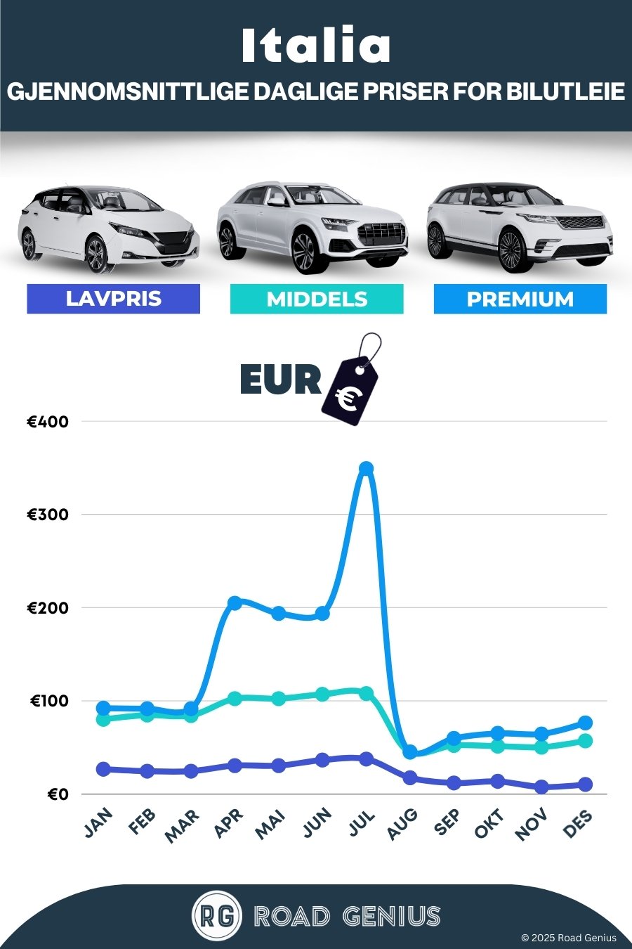 I gjennomsnitt koster bilutleie i Italia rundt €76 per dag, med de billigste alternativene fra €8 per dag.