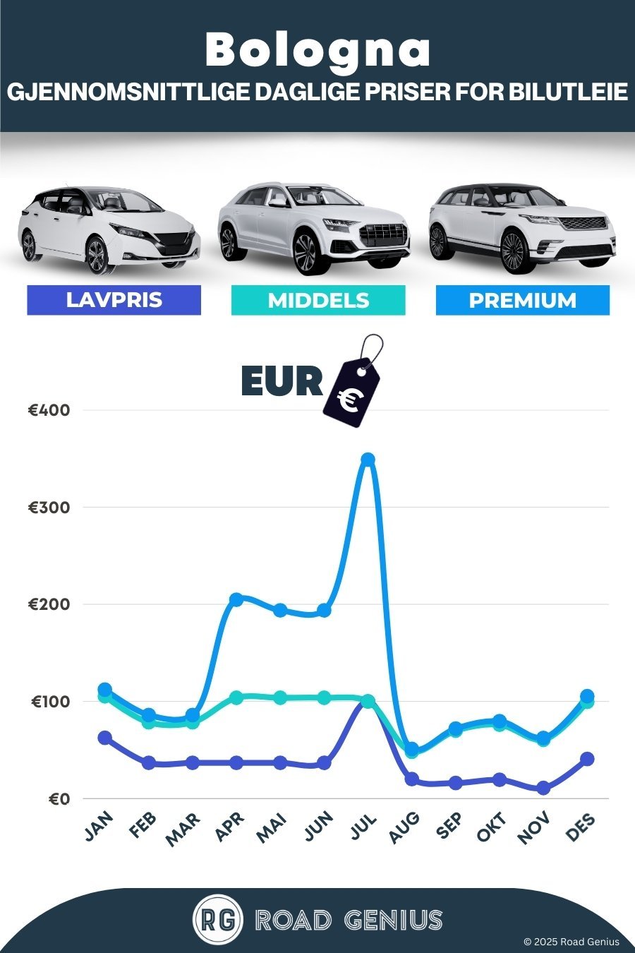 I gjennomsnitt koster bilutleie i Bologna rundt €85 per dag, med de billigste alternativene fra €11 per dag.