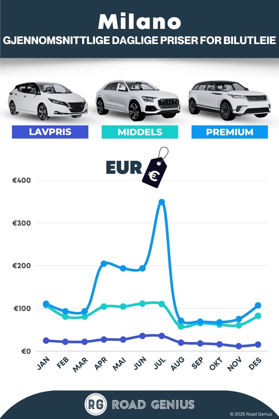 I gjennomsnitt koster bilutleie i Milano rundt €81 per dag, med de billigste alternativene fra €11 per dag.