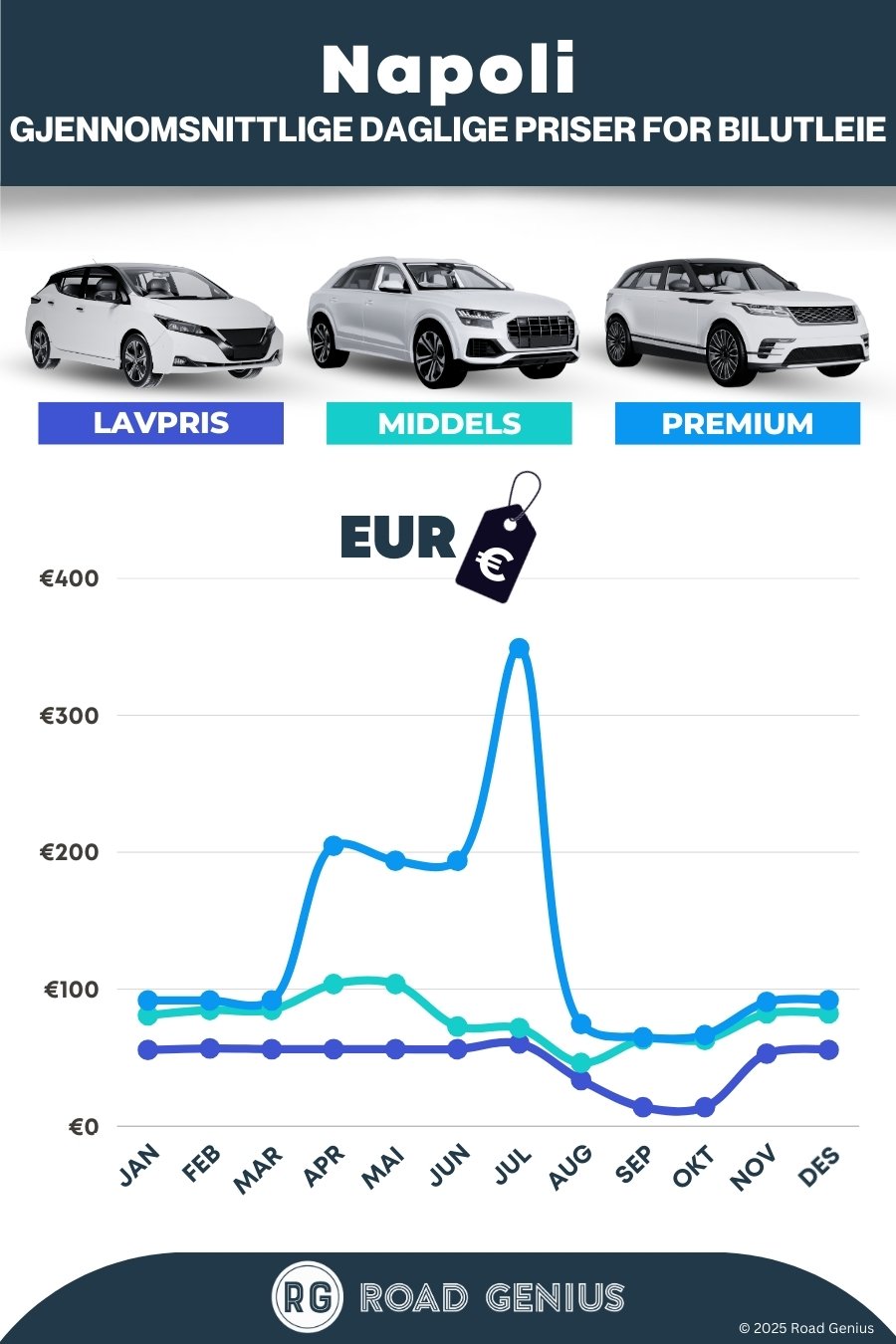 I gjennomsnitt koster bilutleie i Napoli rundt €86 per dag, med de billigste alternativene fra €14 per dag.