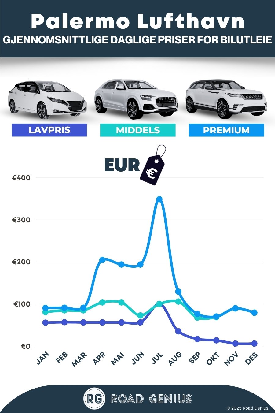 I gjennomsnitt koster bilutleie på Palermo lufthavn rundt €89 per dag, med de billigste alternativene fra €6 per dag.