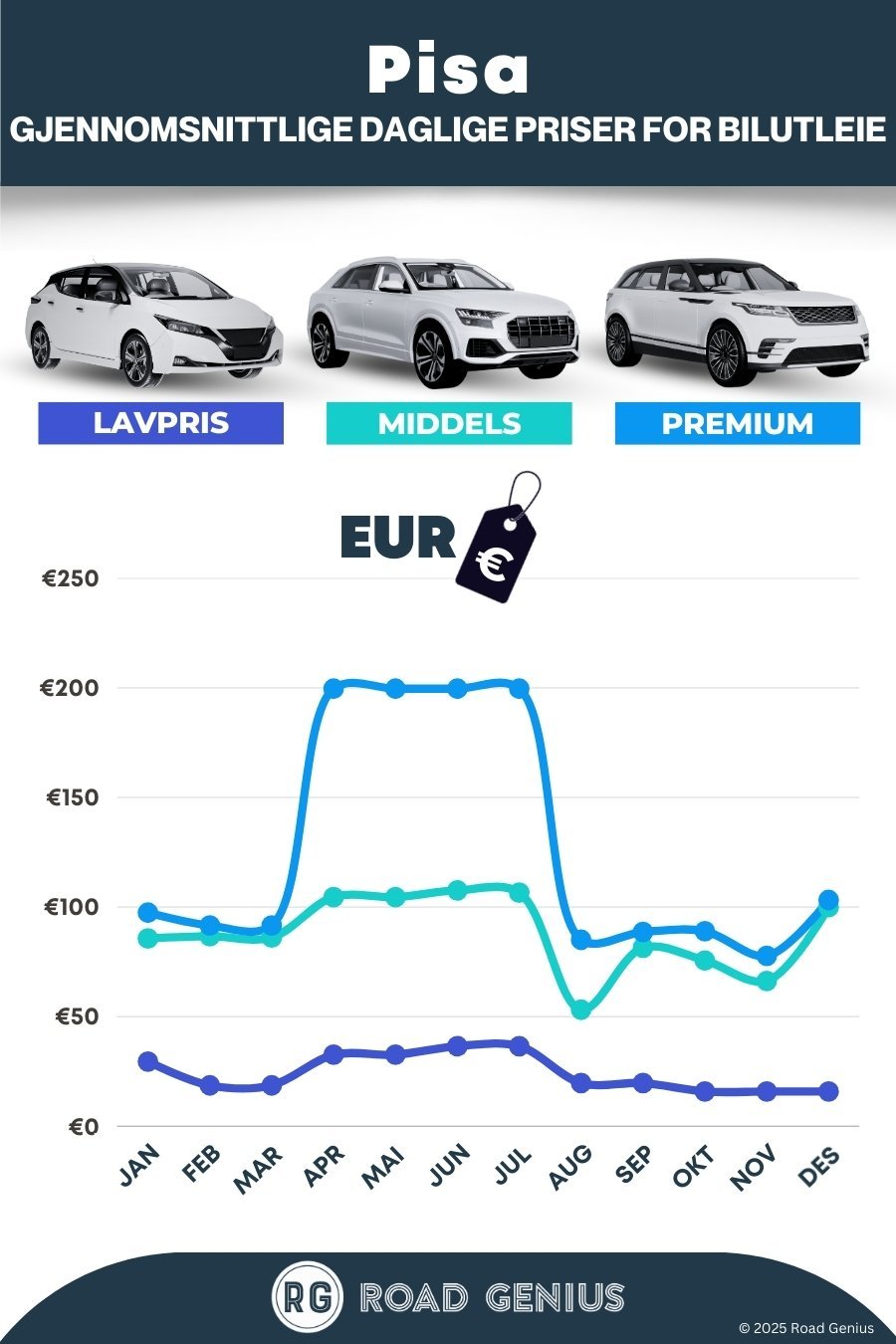 I gjennomsnitt koster bilutleie i Pisa rundt €80 per dag, med de billigste alternativene fra €16 per dag.