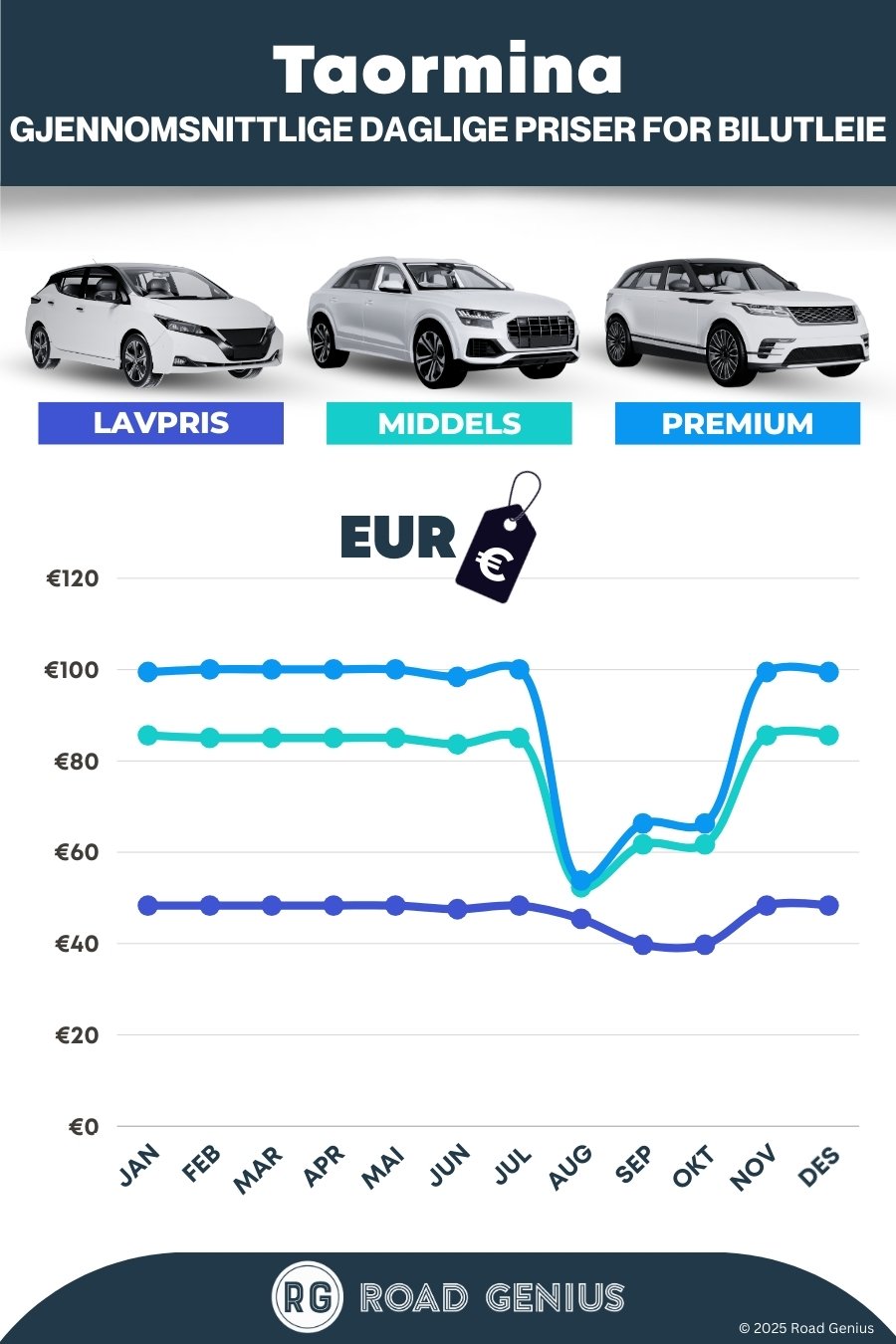 Velg den minste bilen du trenger: En liten bil (økonomi- eller kompaktklasse) gir lavere leiepris og drivstofforbruk – og passer bedre i Taorminas smale gater. Manuelt gir er billigere enn automatgir. Skal du ha automat om sommeren, bør du reservere tidlig.