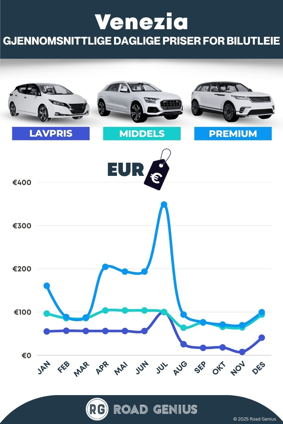 I gjennomsnitt koster bilutleie i Venezia rundt €91 per dag, med de billigste alternativene fra €8 per dag.