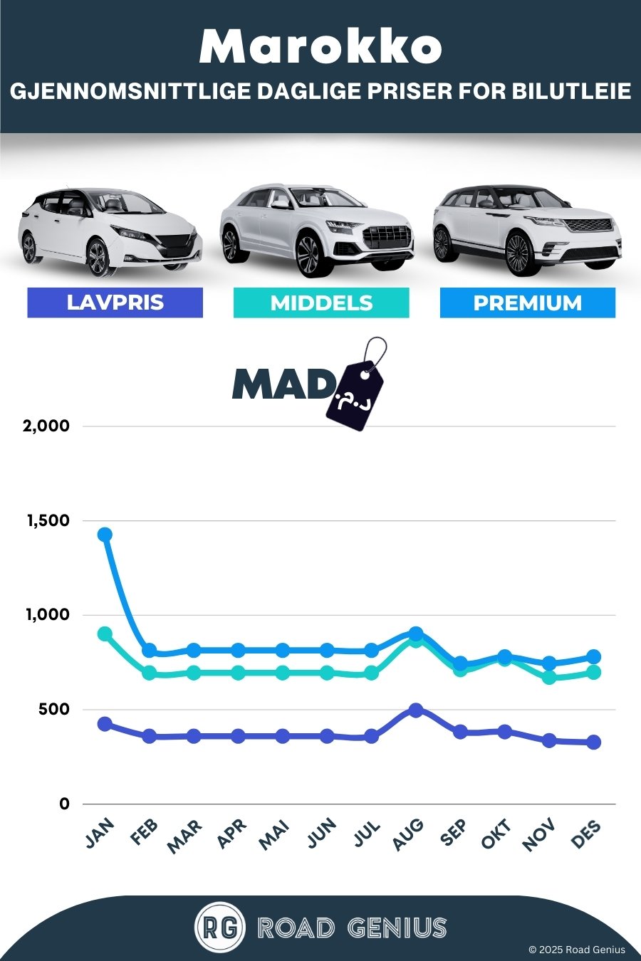I gjennomsnitt koster bilutleie i Marokko rundt MAD 654 per dag, med de billigste alternativene fra MAD 328 per dag.