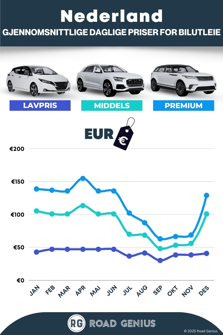 I gjennomsnitt koster bilutleie i Nederlandene rundt €80 per dag, med de billigste alternativene fra €30 per dag.