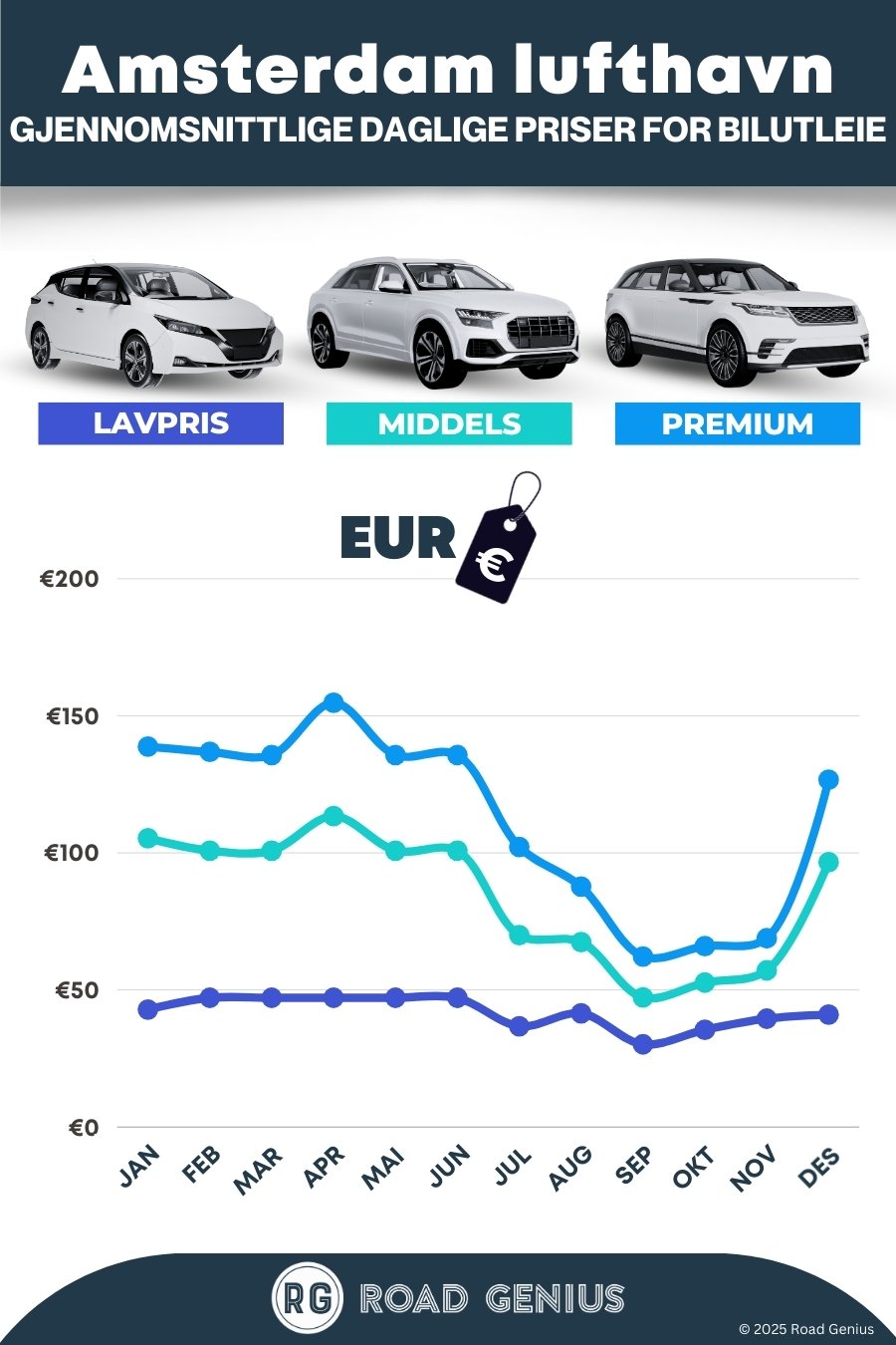 I gjennomsnitt koster bilutleie på Amsterdam lufthavn rundt €80 per dag, med de billigste alternativene fra €30 per dag.