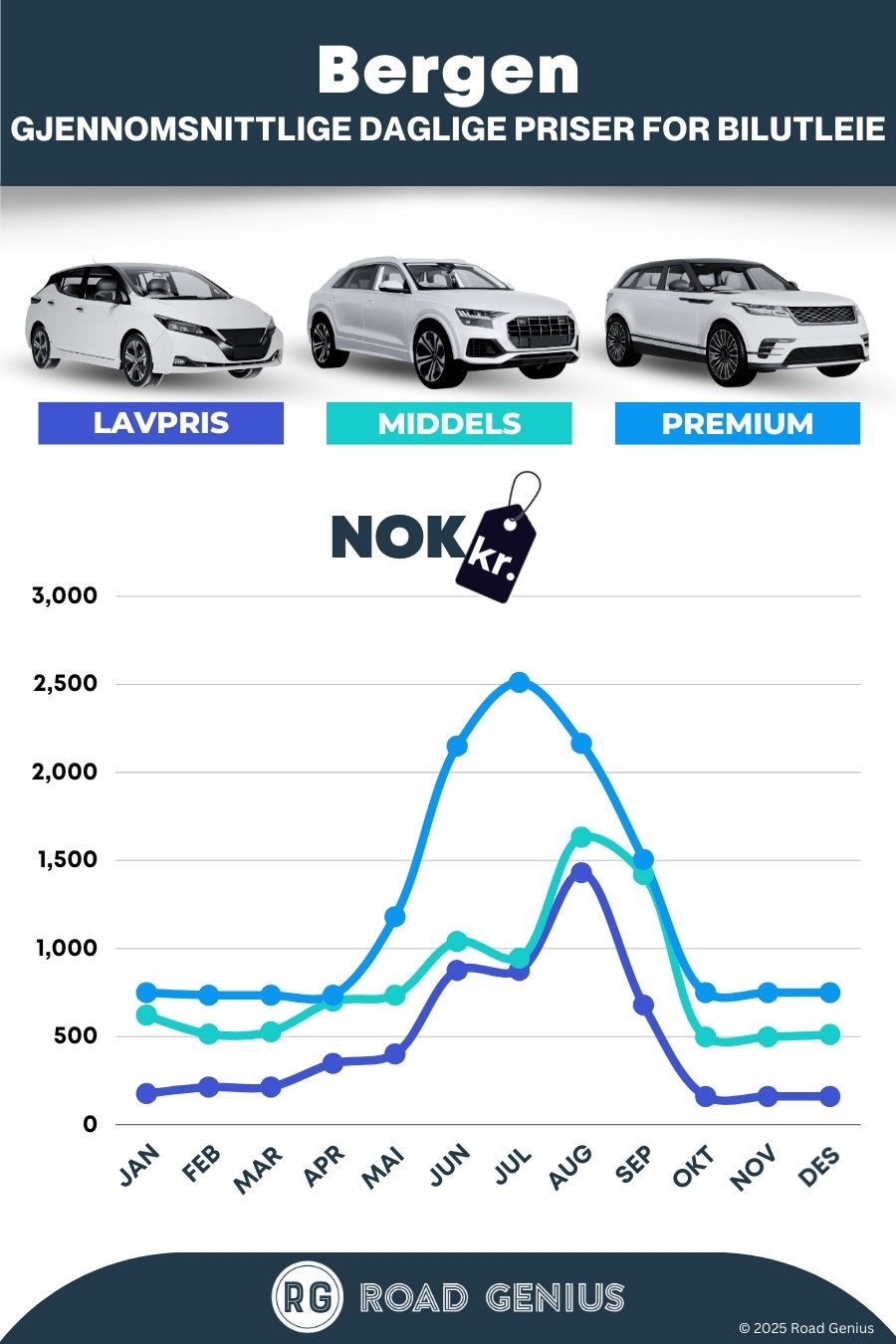 I gjennomsnitt koster bilutleie i Bergen rundt 835 kr per dag, med de billigste alternativene fra 160 kr per dag.