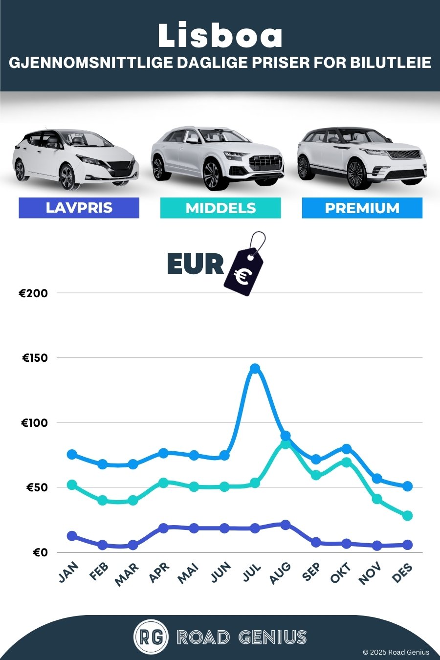 I gjennomsnitt koster bilutleie i Lisboa rundt €47 per dag, med de billigste alternativene fra €5 per dag.