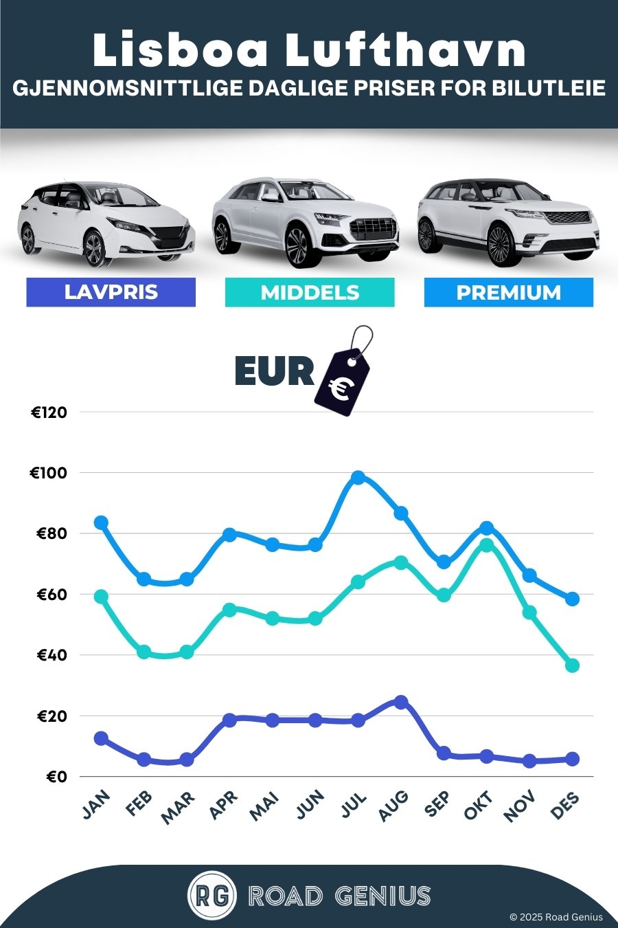 Bør jeg forhåndsbestille bil på Lisboa lufthavn? Ja, spesielt i høysesongen (juni–september). Bilene blir fort utsolgt, og prisene stiger kraftig jo nærmere hentedatoen du kommer.