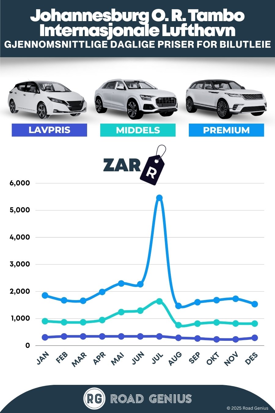 I gjennomsnitt koster bilutleie på Johannesburg O.R. Tambo lufthavn rundt ZAR 1 128 per dag, med de billigste alternativene fra ZAR 230 per dag.