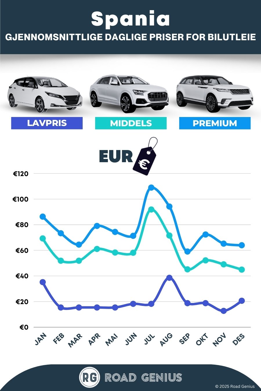 I gjennomsnitt koster bilutleie i Spania rundt €52 per dag, med de billigste alternativene fra €13 per dag.
