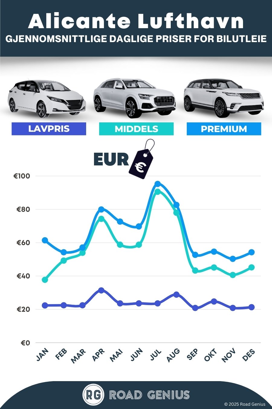 I gjennomsnitt koster bilutleie på Alicante lufthavn rundt €49 per dag, med de billigste alternativene fra €21 per dag.