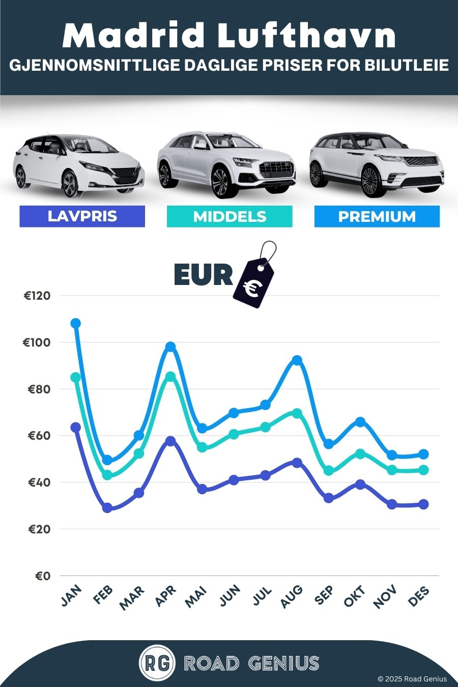 Road Genius gjør det enkelt å finne gode leiebiltilbud på Madrid lufthavn (MAD). Sammenlign priser og bestill på ett sted. Velg blant store leiebilselskaper i terminal 1 og 4, eller hos selskaper som holder til like utenfor flyplassen, med alt fra økonomiklasse til SUVer og biler med automatgir. Hent bilen og kjør rett ut på motorveiene M-40 og A-2 – du når Madrid sentrum på cirka 20–30 minutter utenom rushtiden.