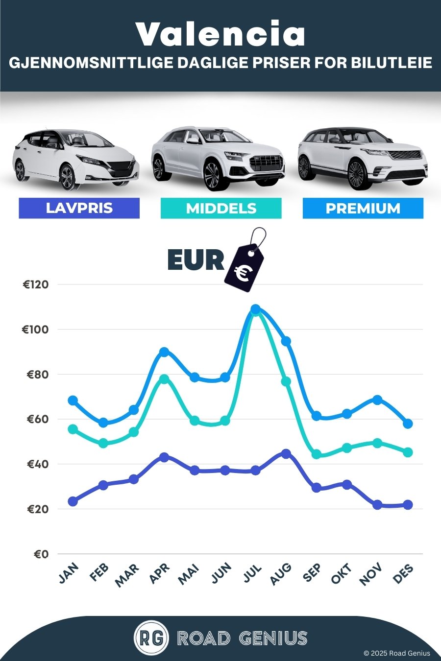 I gjennomsnitt koster bilutleie i Valencia rundt €56 per dag, med de billigste alternativene fra €22 per dag.