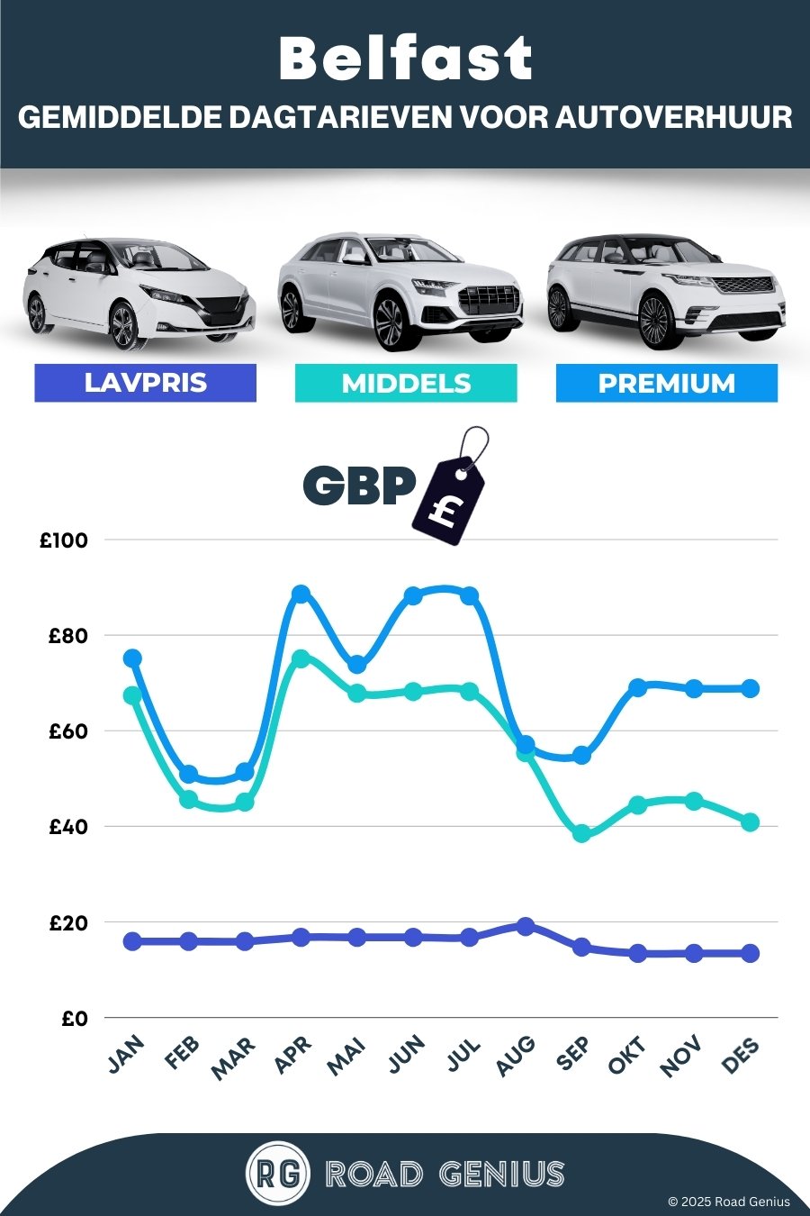 Det er enkelt å finne leiebil i Belfast med Road Genius. Sammenlign priser fra en rekke leiebilselskaper over hele Storbritannia – helt uten bestillingsgebyr. Hent bilen på Belfast internasjonale lufthavn (BFS), George Best Belfast City lufthavn (BHD) eller fra et kontor i sentrum. Filtrer enkelt på biltype, som SUV eller bil med automatgir, og se priser for enveisleie. Alle priser vises uten skjulte gebyrer.
