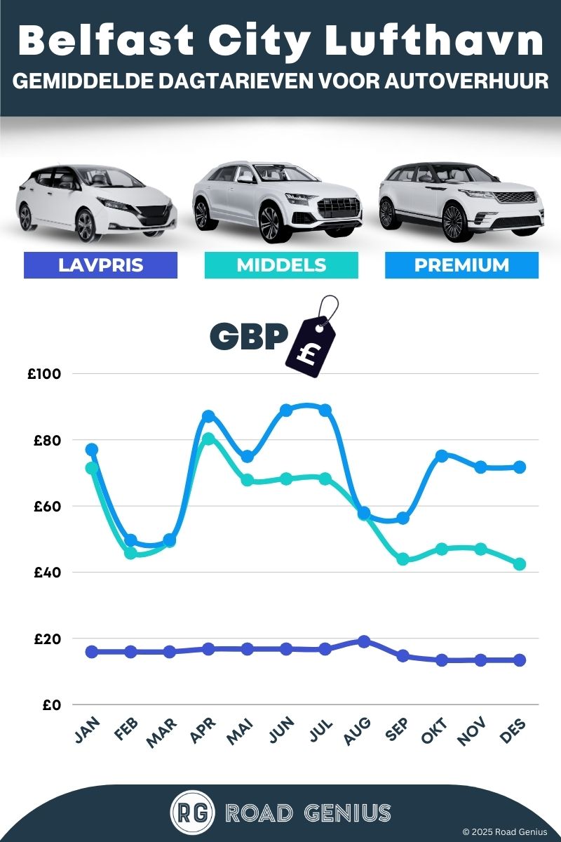I gjennomsnitt koster bilutleie på Belfast City lufthavn rundt €48 per dag, med de billigste alternativene fra €13 per dag.