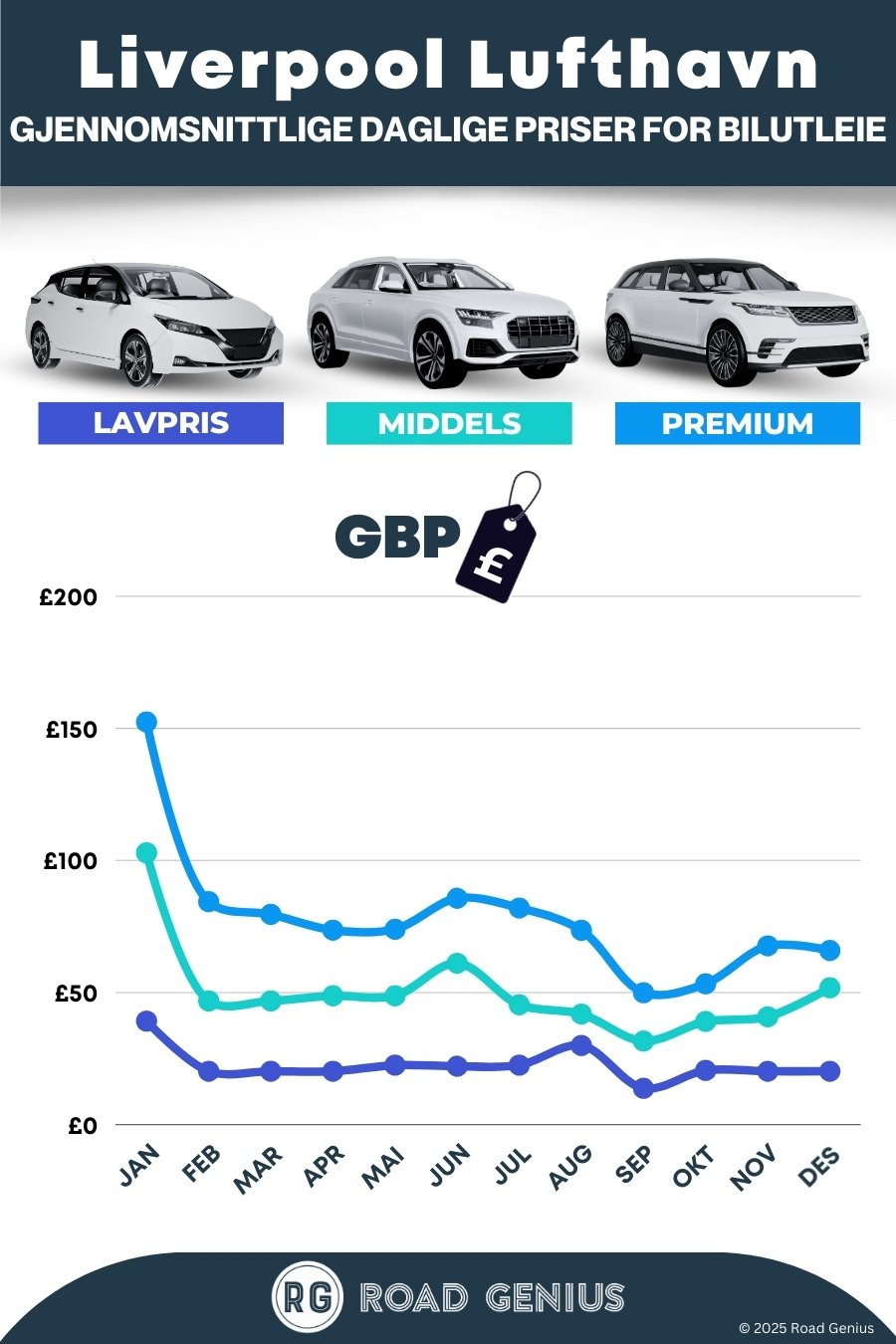 I gjennomsnitt koster bilutleie på Liverpool lufthavn rundt €51 per dag, med de billigste alternativene fra €14 per dag.