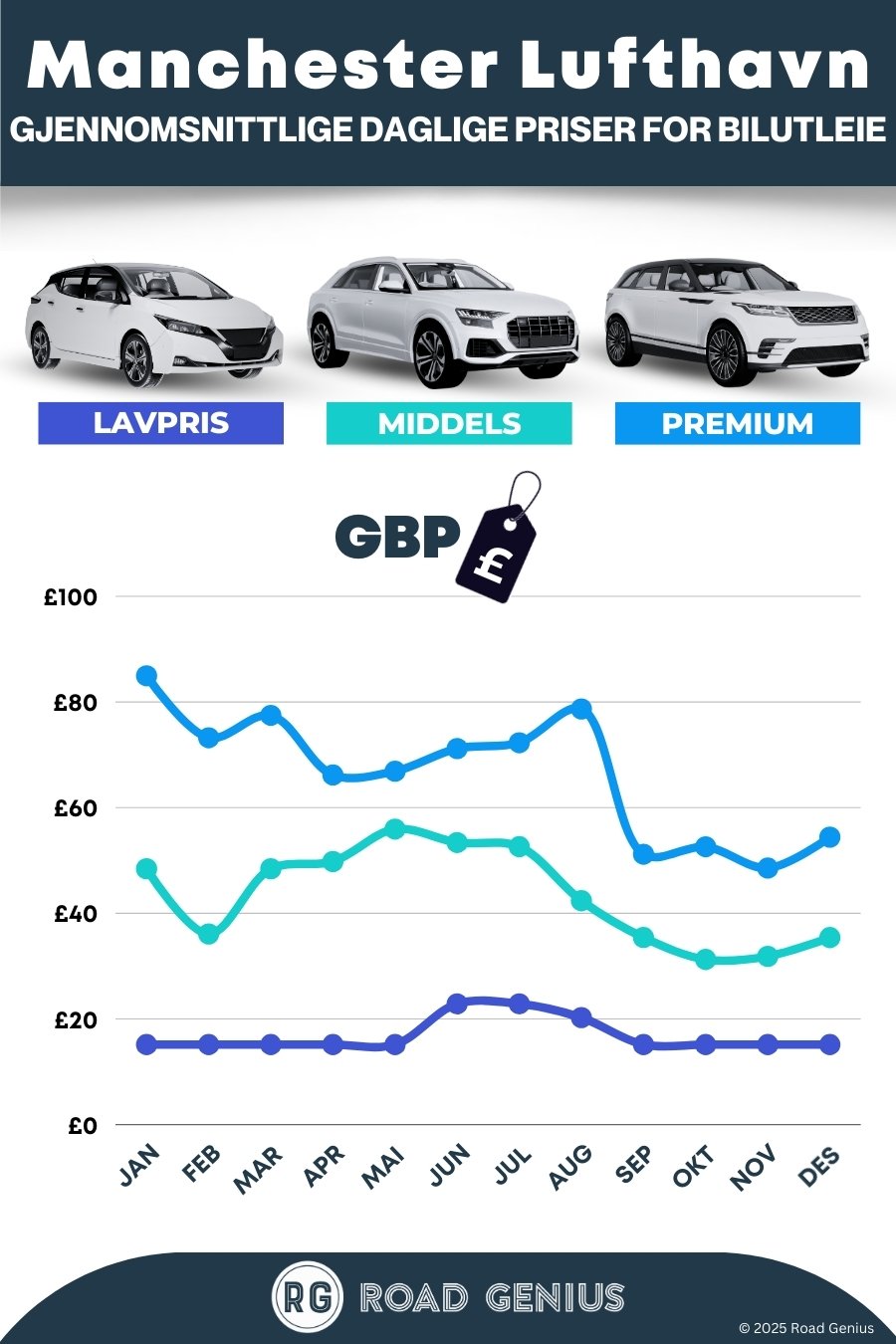I gjennomsnitt koster bilutleie på Manchester lufthavn rundt €42 per dag, med de billigste alternativene fra €15 per dag.