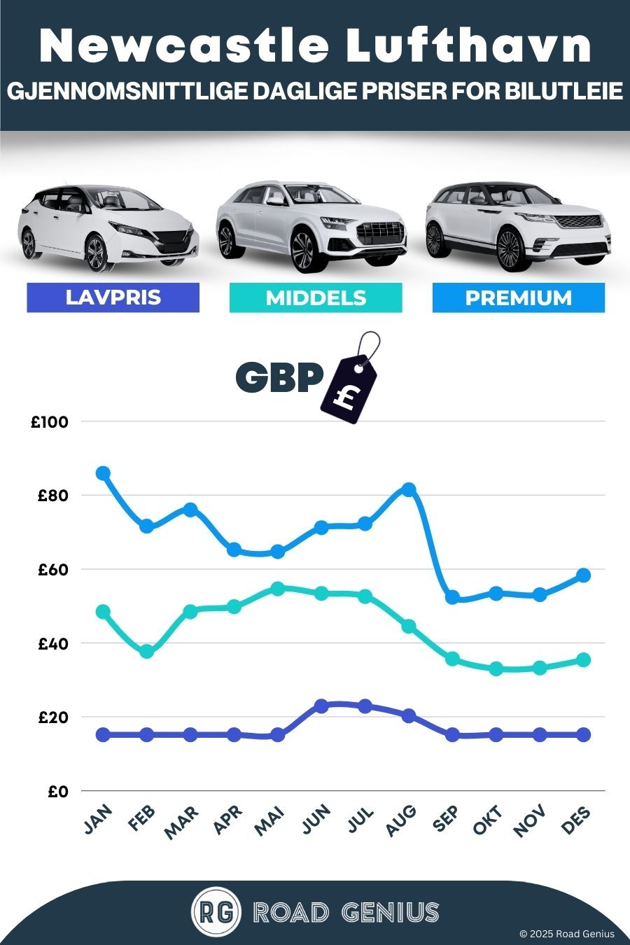 I gjennomsnitt koster bilutleie på Newcastle lufthavn rundt €55 per dag, med de billigste alternativene fra €12 per dag.