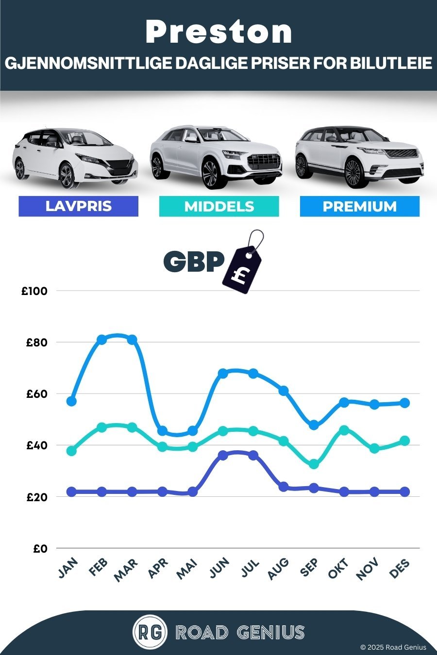 Vær fleksibel med datoer og tider: På hverdager er det ofte forretningsreisende som leier bil i Preston, noe som kan påvirke prisene. Se etter gode tilbud fra fredag til mandag. I travle perioder, som før jul, ved semesterstart på universitetet eller på kampdager for det lokale fotballaget (PNE), lønner det seg å bestille 2–3 uker i forveien.