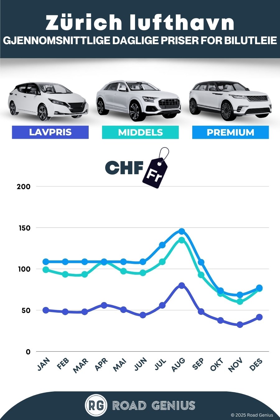I gjennomsnitt koster bilutleie på Zürich lufthavn rundt CHF 76 per dag, med de billigste alternativene fra CHF 25 per dag.