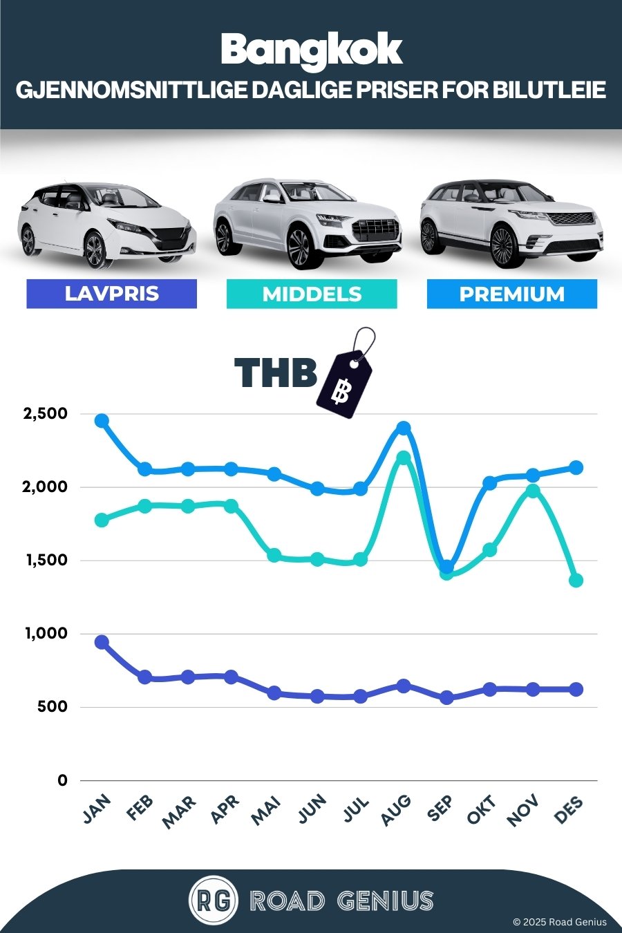 I gjennomsnitt koster bilutleie i Bangkok rundt THB 2 150 per dag, med de billigste alternativene fra THB 566 per dag.
