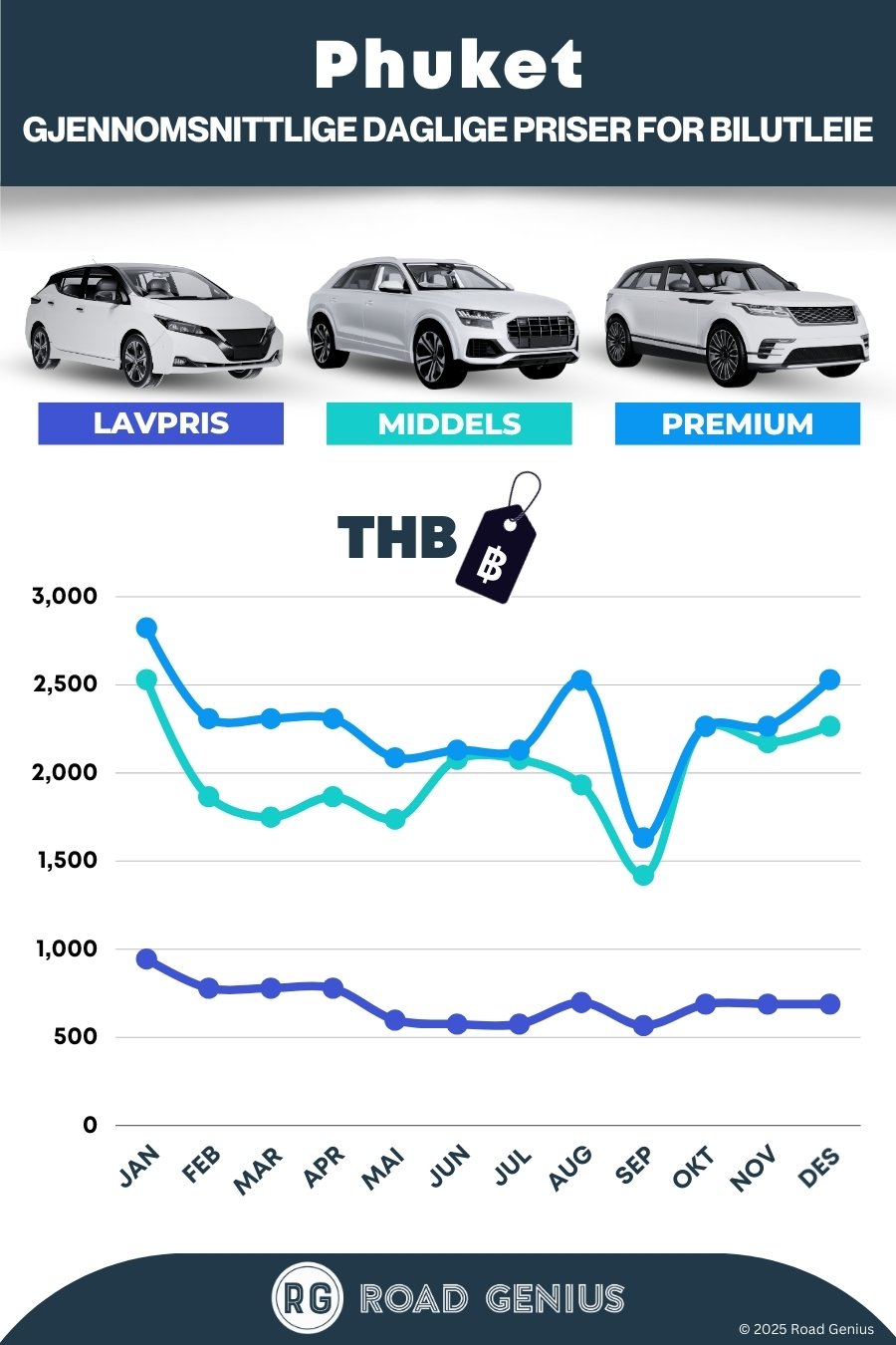 I Phukets høysesong (desember–februar og i høytider) stiger prisene, og bilene blir fort utsolgt. Bestill 3–4 uker i forveien for å sikre god pris og ønsket bilklasse.