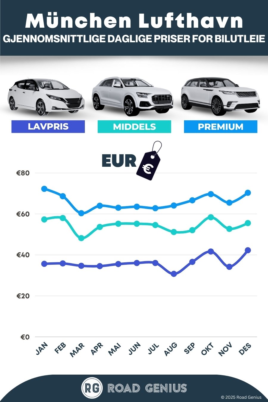 I gjennomsnitt koster bilutleie på München lufthavn rundt €52 per dag, med de billigste alternativene fra €31 per dag.