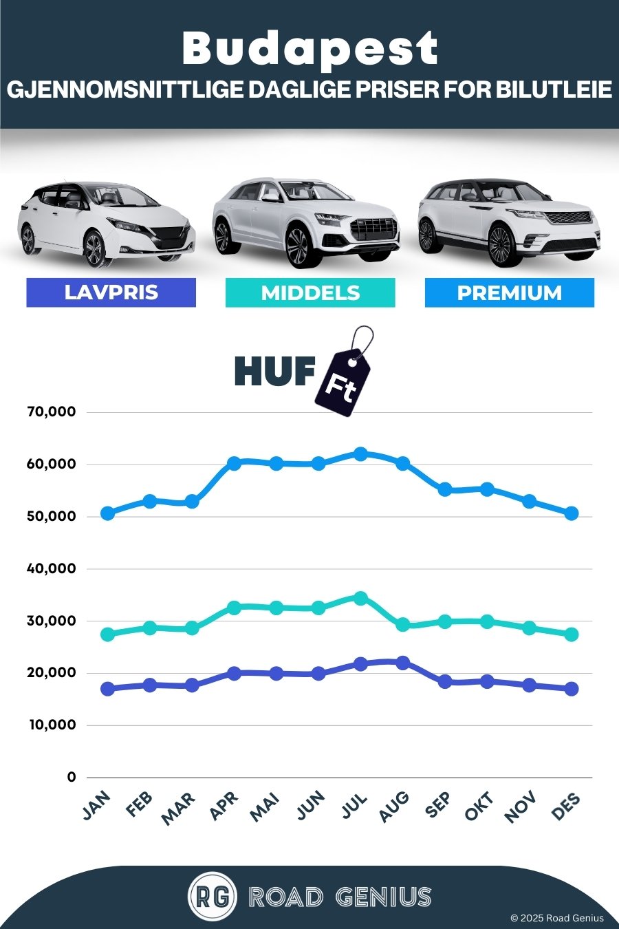 I gjennomsnitt koster bilutleie i Budapest rundt 35 103 HUF per dag, med de billigste alternativene fra 17 023 HUF per dag.