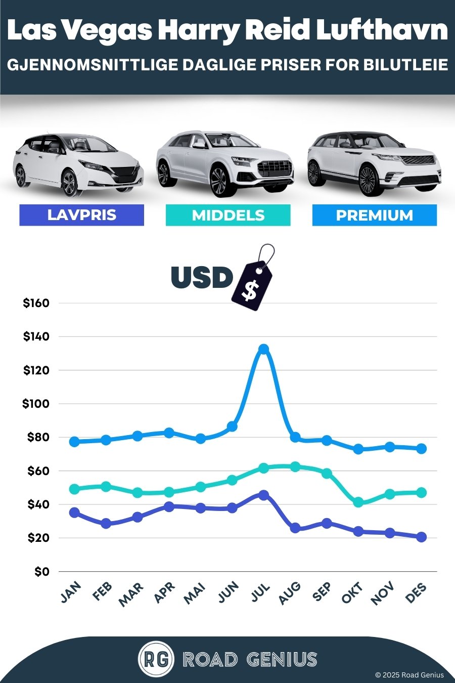 I gjennomsnitt koster bilutleie på Las Vegas Harry Reid lufthavn rundt USD 55 per dag, med de billigste alternativene fra USD 21 per dag.