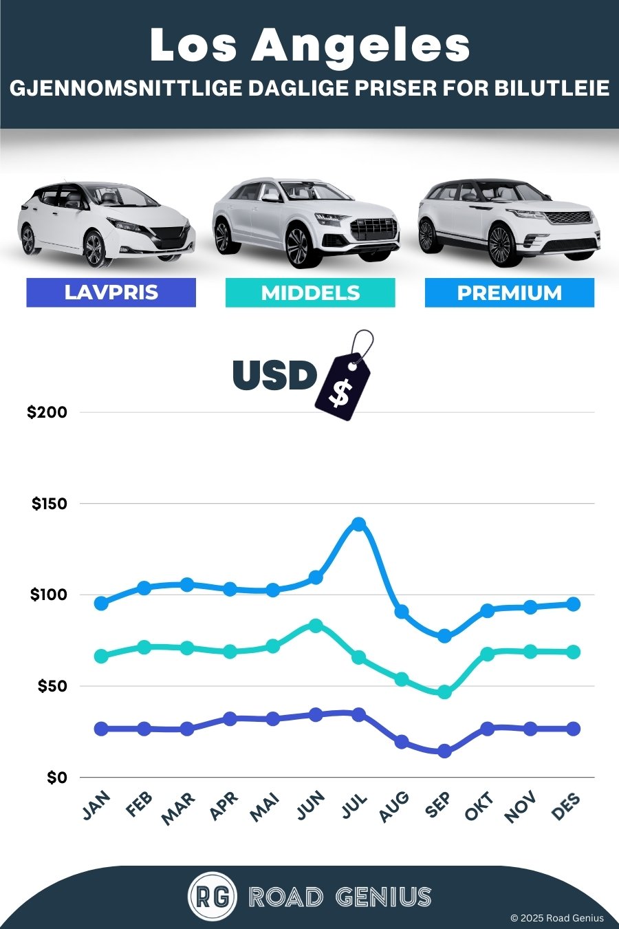 I gjennomsnitt koster bilutleie i Los Angeles omtrent USD $65 per dag, med de billigste leiebilene fra USD $14 per dag.