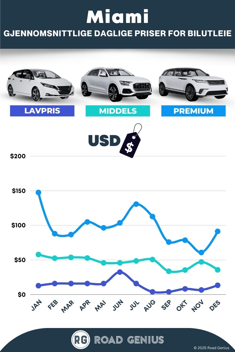Med Road Genius er det enkelt å finne leiebil i Miami. Sammenlign priser fra en rekke kjente leiebilselskaper i USA – helt uten bestillingsgebyrer. Du kan hente bilen på Miami International Airport (MIA) eller ved et bykontor for enkelt å utforske steder som South Beach, Everglades og Florida Keys. Prisene på flyplassen er ofte rundt 18 % høyere enn i sentrum, så det kan lønne seg å sammenligne begge deler. Bestill i god tid, spesielt for reiser i høysesongen fra desember til april.