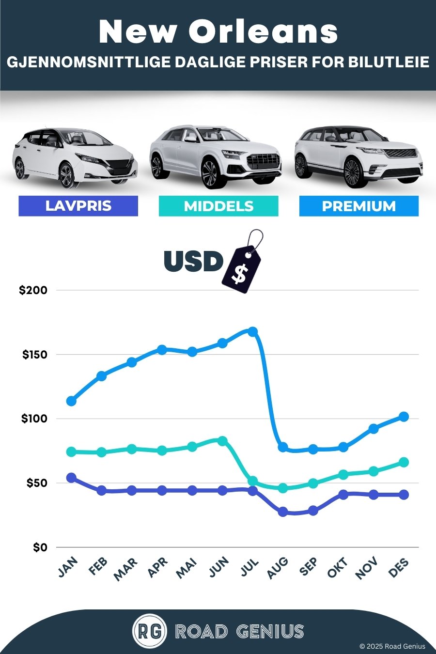 Vær fleksibel med datoer: Henting mandag–onsdag kan være rimeligere enn i helgen. Skal du reise under Mardi Gras eller Jazz Fest, bør du bestille måneder i forveien. Sommeren har ofte lavere priser.