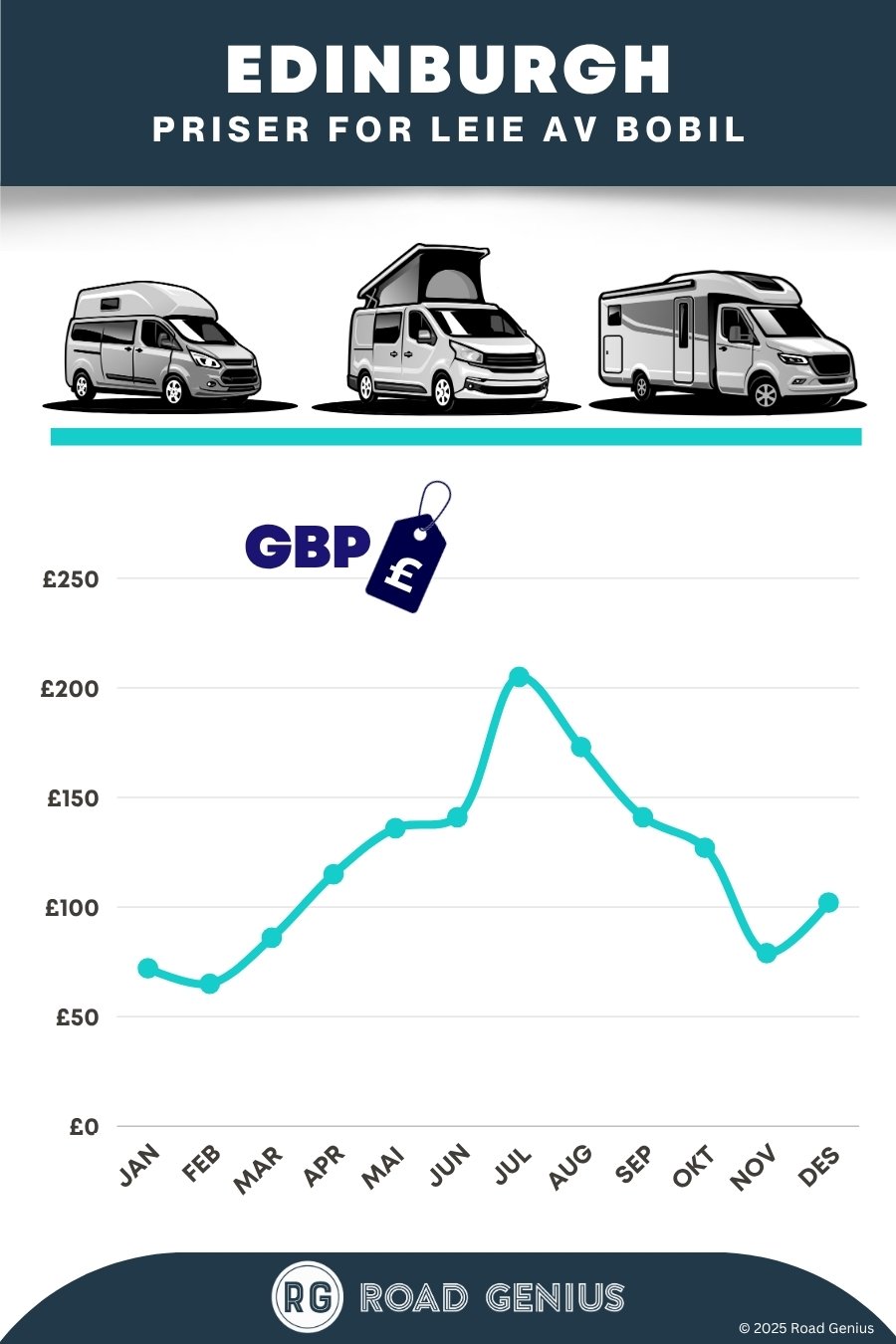 Hos Road Genius sammenligner du tilbud på bobilutleie i hele Skottland, og finner enkelt den perfekte bobilen for turen til Høylandet eller langs den berømte NC500-ruten. Takket være Edinburgh internasjonale lufthavn, Waverley jernbanestasjon og byens innfartsparkeringer er hovedstaden et populært og praktisk sted å starte bobilreisen. Været kan skifte raskt, så det er lurt å planlegge både drivstoffylling og overnattinger på forhånd. Vær også oppmerksom på at enkelte veier har bompenger.
