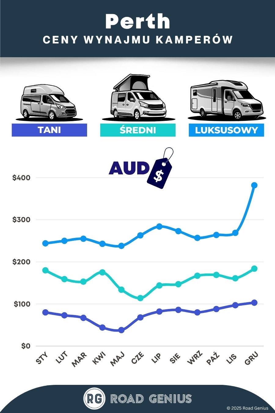 Wynajem kamperów w Perth zazwyczaj waha się od AUD 45 do 380 za dzień. Ceny zależą od wielkości, wieku, wyposażenia kampera, długości rezerwacji, pory roku, lokalizacji odbioru i zwrotu, a także od tego, czy wynajem jest w jedną stronę, czy w obie.