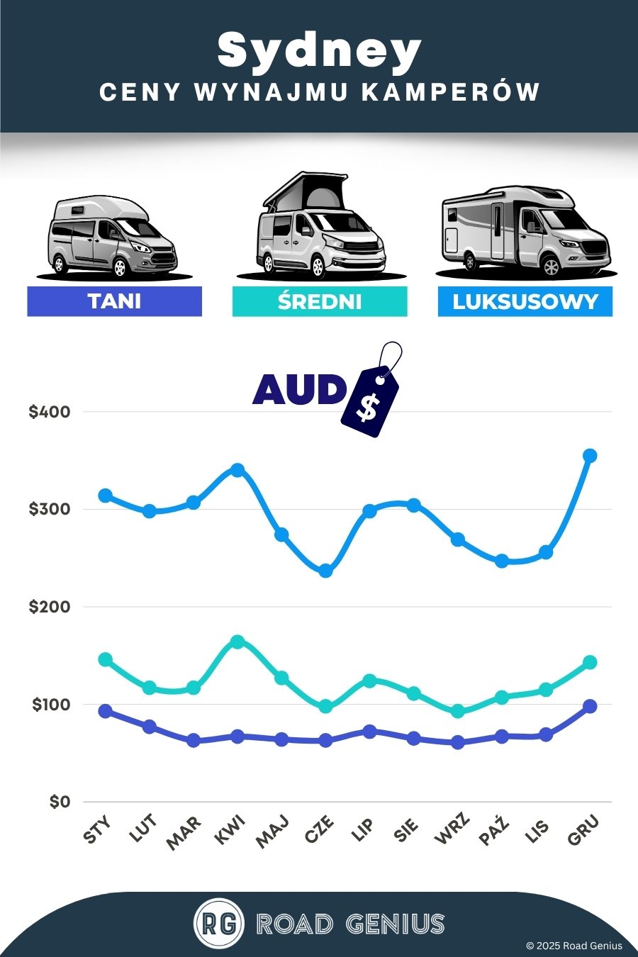 Wynajem kamperów w Sydney zazwyczaj kosztuje od 70 do 360 AUD za dzień. Cena za dzień może zależeć od wielkości i wieku kampera, dostępnych udogodnień, długości rezerwacji, pory roku oraz tego, czy podróż jest w jedną stronę, czy w obie.