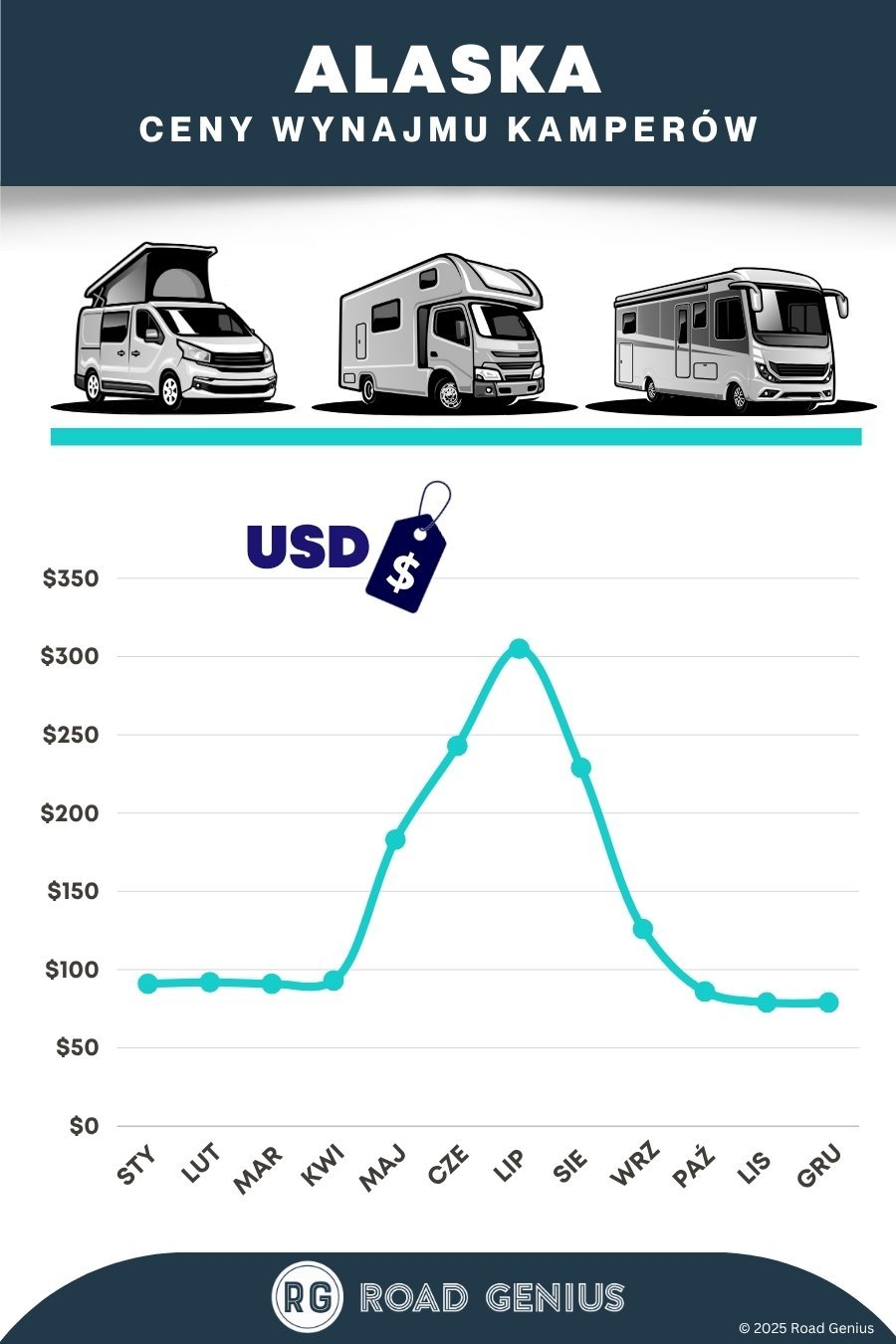 Road Genius porównuje oferty wynajmu kamperów od wielu dostawców, abyś mógł wybrać najlepszy pojazd na drogi Alaski. Większość podróżnych rozpoczyna swoją przygodę w Anchorage lub Fairbanks, podróżuje drogami Seward Highway, Parks Highway lub Alaska Highway i zwiedza Park Narodowy Denali, fiordy Kenai oraz Półwysep Kenai. Długość dnia, pogoda i dostępność usług szybko zmieniają się w zależności od pory roku, dlatego starannie zaplanuj termin podróży.